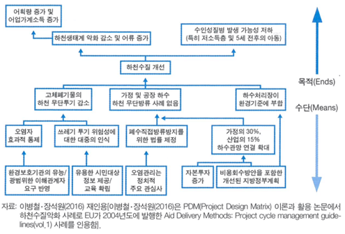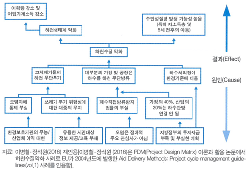 <그림 9>는<그림 4>의 ‘하천 수질 개선 프로젝트’의 문제 나무를 표현한 모습이에요. 해당 프로젝트는 대상 지역의 하천 수질이 악화된 상태를 전제로 하기 때문에, <그림 9>와 같이 현재 상황의 문제점을 분석할 수 있어요.