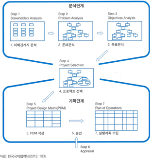 ‘분석 단계(상황분석)’는 1. 이해관계자 분석 -> 2. 문제분석 -> 3. 목표분석을 통해 이루어져요. 분석을 통해 프로젝트를 선택한 후(계획단계)에는 이러한 분석을 토대로 PDM을 작성하고, 세부 활동계획을 세우고, 투입물 및 예산과 관련된 계획을 세우게 됩니다.