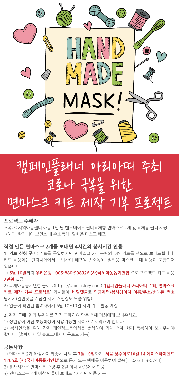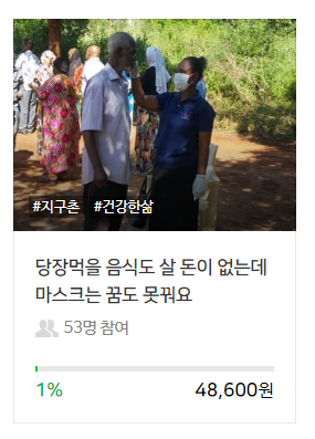 손소독제와 마스크로 최소한의 보호를 받을 수 있도록 도와주세요.국제아동돕기연합의 사업장이 있는 탄자니아 탕가에서도 확진자가 3명이 나왔습니다. 실제로는 더 많은 감염자가 있을 것으로 추정하고 있으나 많은 가정은 위생적인 식수 시설뿐 아니라 화장실 조차 갖춰져 있지 않은 곳에 살고 있기에 지역사회의 감염이 퍼지게 된다면 걷잡을 수 없을지도 모릅니다. 국제아동돕기연합에서는 오지마을 주민들에게 손소독제 배포와 코로나19 보건교육을 실시하였지만 많은 이들에게 손소독제와 마스크를 나눠주기에 힘든 실정입니다. 탄자니아 탕가시 5세 미만 아동건강관리센터(U-CENTER)를 찾아오는 아이들과 보호자들에게 손소독제와 마스크를 배포하기 위한 노력에 여러분들의 동참을 부탁드립니다.