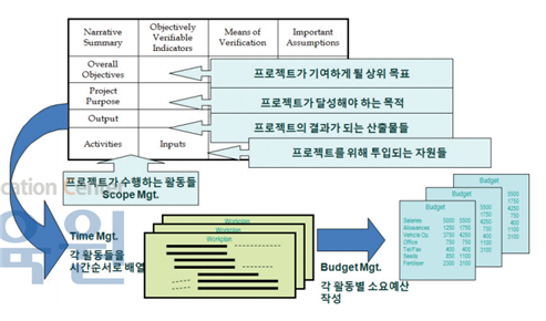 PDM 작성은 이처럼 4×4 표를 채우는 작업이 아니라, 일련의 사업계획을 통해 얻어지는 결과를 요약한 하나의 산출물이에요. 따라서 PDM 작성을 완료했다는 것은 프로젝트가 타당하며 실현 가능하다는 것을 입증할 수 있다는 의미에요. 프로젝트 세부계획은 이를 실현하기 위한 예산관리, 일정관리, 성과관리 등(<그림 10>)이므로, PDM을 근거로 프로젝트 계획을 수월하게 수립할 수 있어요.