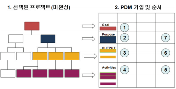 PDM을 작성하는 데 있어 위의 순서는 절대적인 것은 아니라고 해요. 사전 분석기법이 다양하듯이, 위의 순서는 목표나무나 문제분석 등을 활용하지 않을 경우 차이가 날 수 있어요.