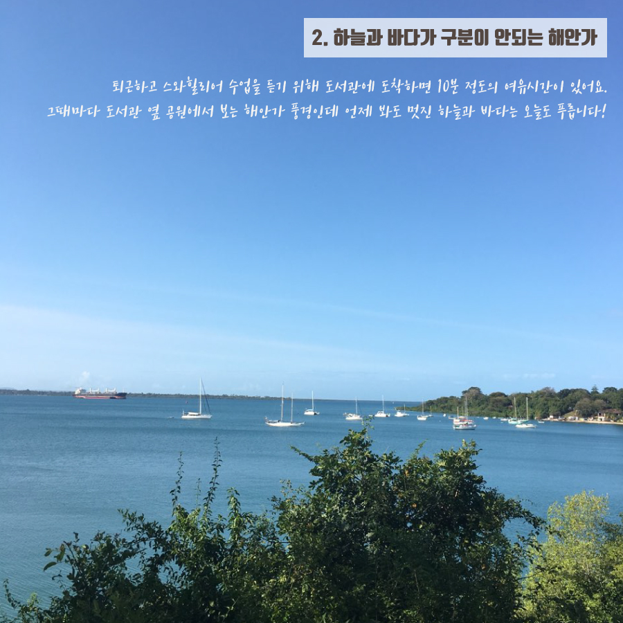 울창한 나무 사이로 보이는 바다 풍경이 너무 아름다웠어요 :)