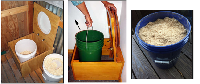 그림 5 : 친환경 화장실의 구성 - 차례로 화장실 캐비닛, 양동이, 덮개 물질